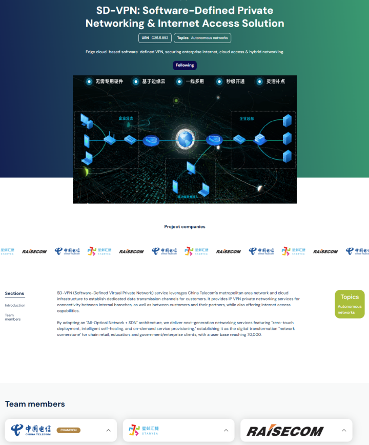 “SD-VPN不仅是技术的突破,更是服务模式的创新。” 星邺汇捷项目负责人表示,“我们与四川电信紧密协作,将通信网络经验与软件能力深度融合,为客户提供极简部署、弹性扩容和智能运维的组网服务。”目前,该方案正积极推动纳入TM Forum国际标准(TMF620/622/629),并通过目录标准化与API自动化能力,加速全球行业生态共建。